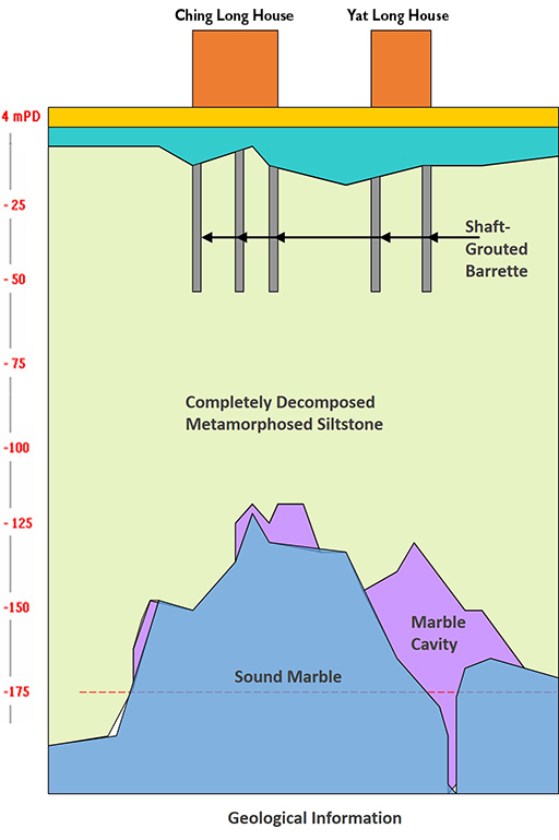 Long Ching Estate, Yuen Long is also located at a marble cavity area. The GI revealed that the site was underlain by marble cavity at a relatively deep level below ground. Such situation rendered the spread of building loads by using common pile type not effective. The HD therefore introduced a new pile foundation system called Shaft-Grouted Barrette, in which grouting was carried out around the perimeter of the pile so as to increase the thickness of the soil. As a result, the friction between the pile and the soil for was formed to provide adequate support to taller buildings. |