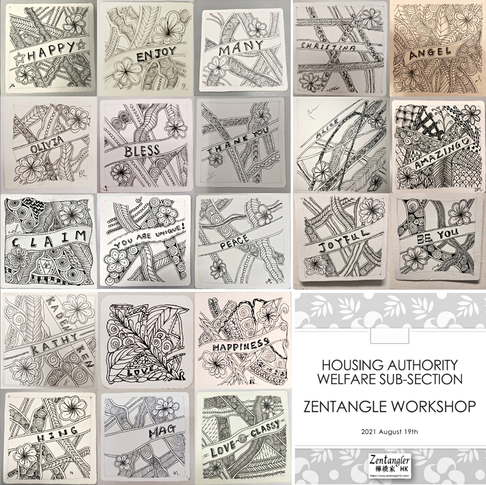 房屋委員會職員同樂會(同樂會)8月19日舉辦「禪繞畫網上工作坊」,邀請獲國際認可禪繞專業資格的導師,向參加工作坊的同事講解禪繞哲學和益處,並教授繪畫技巧。工作坊後,導師把同事的作品合併成馬賽克圖,以作留念。 |