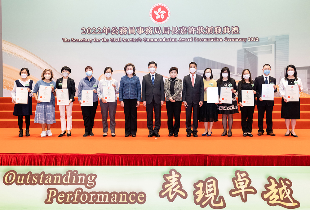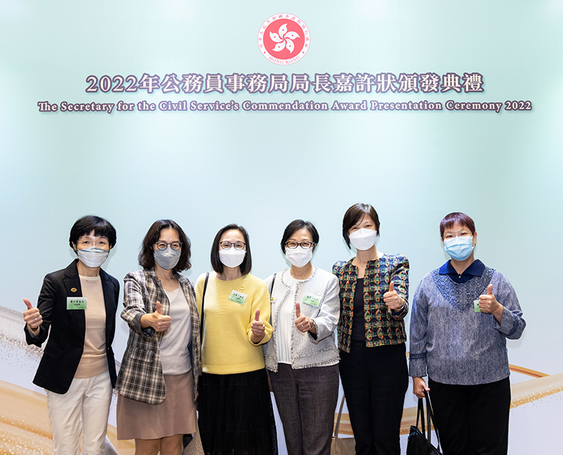 房屋署高級建築師黃少芬、高級房屋事務經理敖寶玲、高級工程監督龔汝綸、一級私人秘書許惠芳和文書主任施麗華憑着優秀的工作表現,獲頒2022年公務員事務局局長嘉許狀。