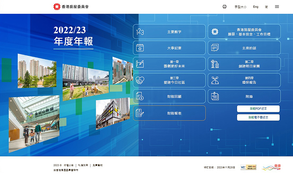 香港房屋委員會(房委會)2022/23年度的年報及財務報表已經出版,並上載於房委會/房屋署網站。年報詳述房委會年內在各範疇的工作,展示全力推進公營房屋發展計劃的決心,為有需要市民提供可負擔的房屋;並從設計新公營房屋項目,以至改善現有公共屋邨和日常屋邨管理工作各方面,推行不同措施,以提升居民的幸福感。